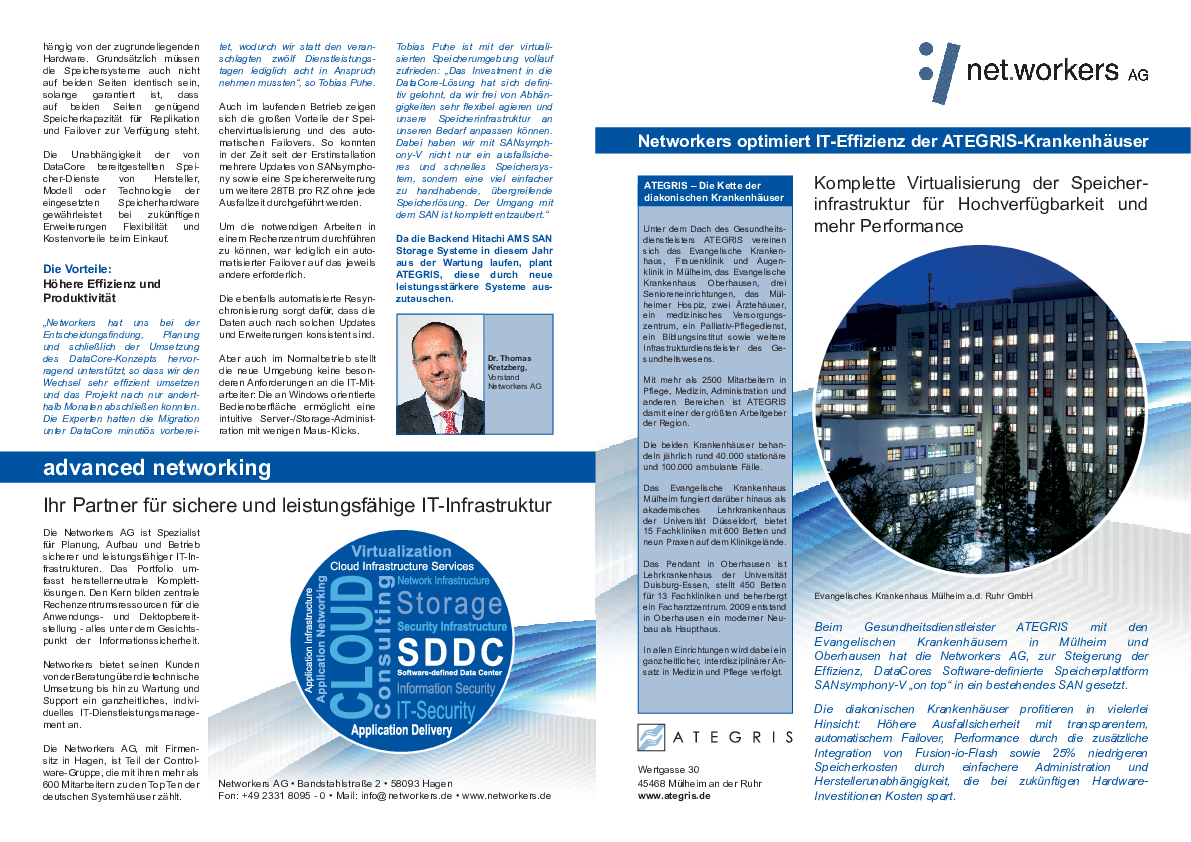 Beim Gesundheitsdienstleister ATEGRIS mit den Evangelischen Krankenhäusern in Mülheim und Oberhausen hat die Networkers AG, zur Steigerung der Effizienz, DataCores Software-definierte Speicherplattform SANsymphony-V „on top“ in ein bestehendes SAN gesetzt.